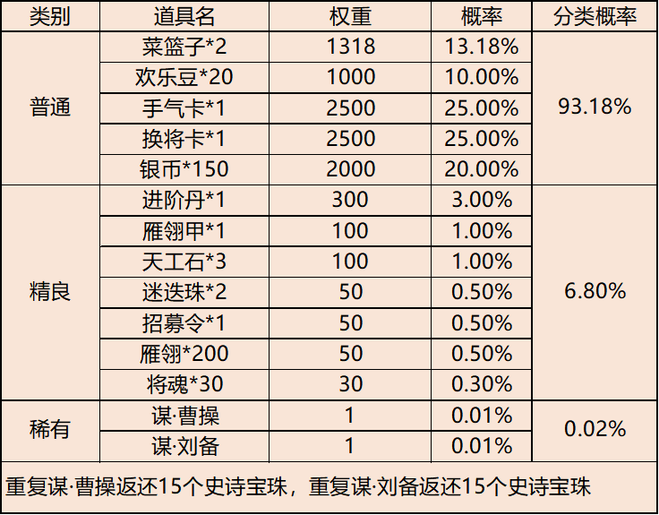 【青梅礼】:打开有几率获得谋·曹操、谋·刘备、天工石、迷迭珠等奖励,具体掉落概率如下: