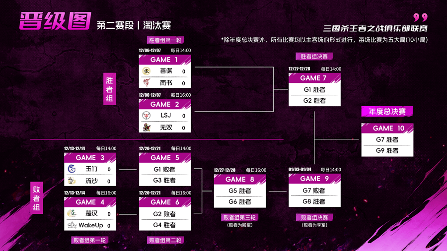 第二赛段,采用佩奇赛制,分为主客场进行(除最终决赛G10外均分为主客场)。除最终总决赛打满7个大局外,其余场次每场比赛打满5个大局,比赛共可分为5轮,每轮安排如下: