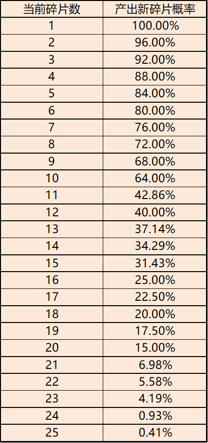 8.新碎片的产出概率与本期活动累计获得的碎片数有关,综上,对应的概率如下所示: