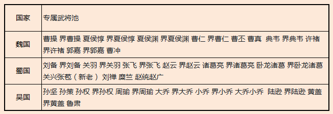 PS:当使用国家专属武将池外的武将时,武将国籍显示为从势力(例:从蜀,从吴,从魏),从势力将视为主势力(例:从蜀势力也属于蜀势力)