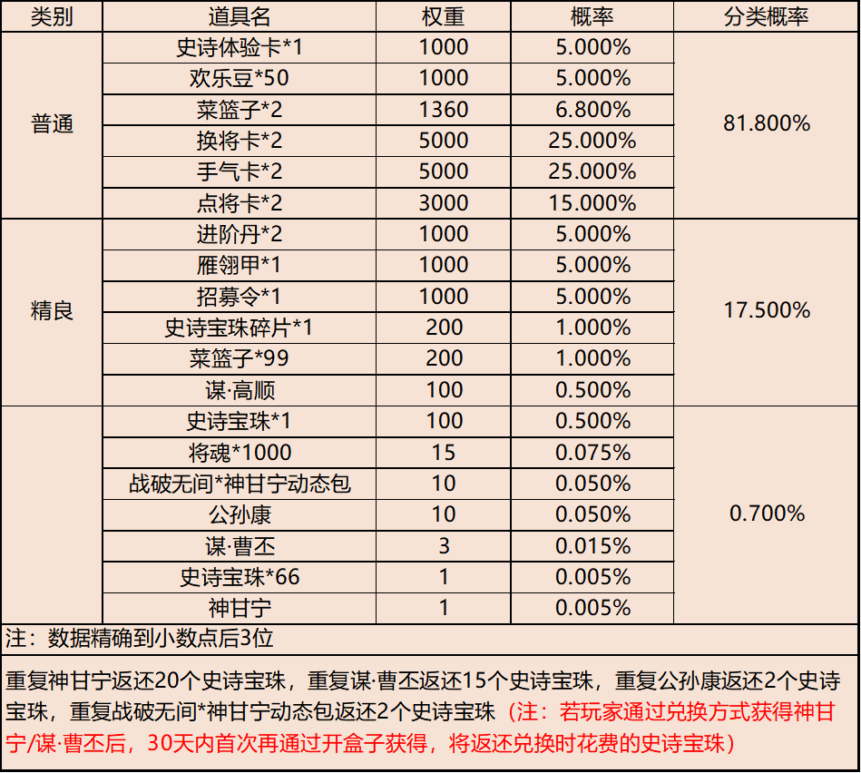打开必得将魂*2、雁翎*20、心愿积分*1,额外几率开出以下道具: