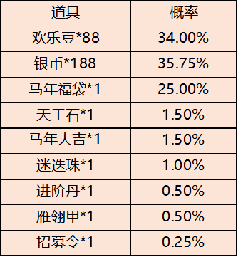 马年大吉上线,200元宝/个,1000元宝/5个,4000元宝/20个,10000元宝/50个;