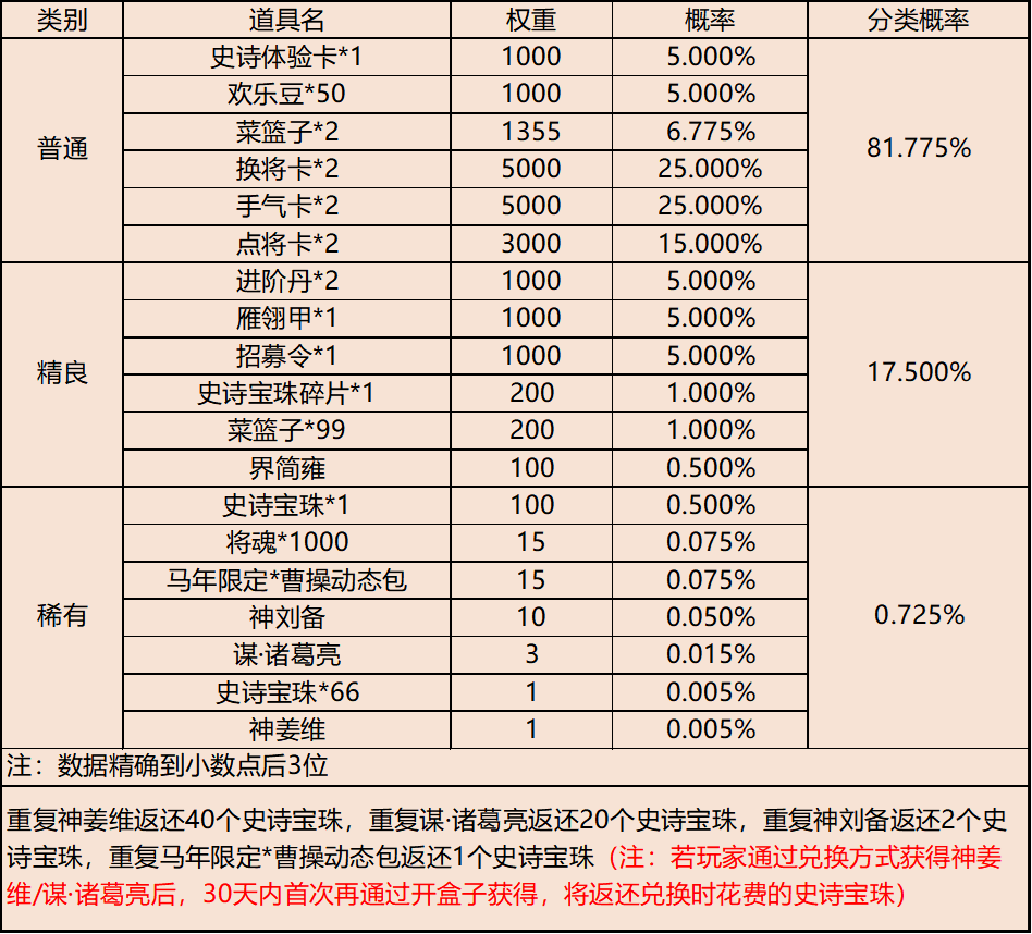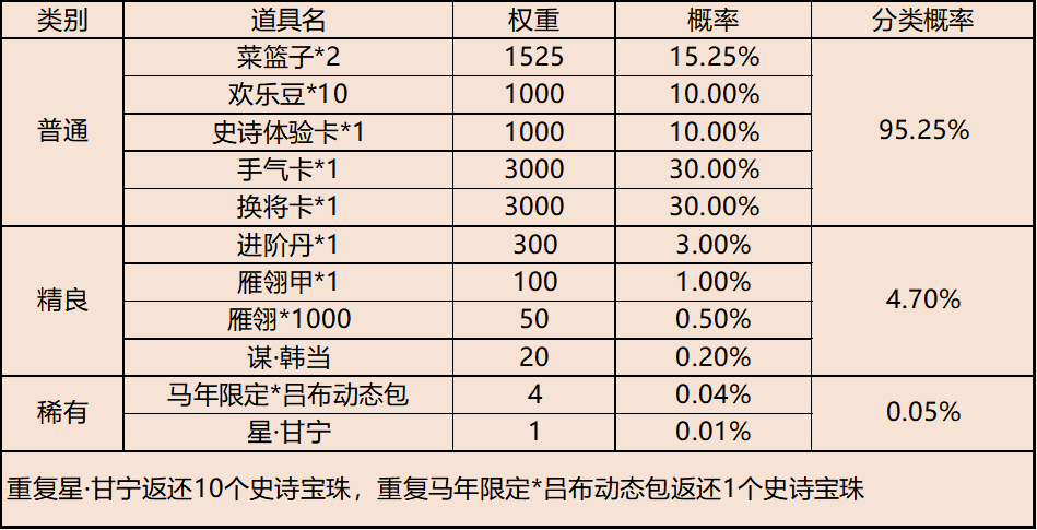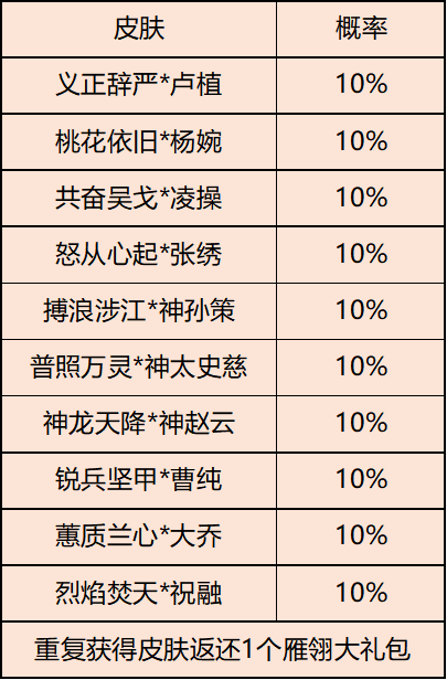 打开必得将魂*2、雁翎*20、心愿积分*1,额外几率开出以下道具: