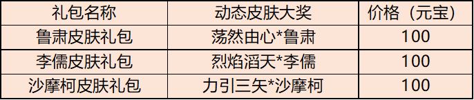 礼包限时购系列(荡然由心*鲁肃、烈焰滔天*李儒、力引三矢*沙摩柯)累计开启600个必中对应礼包的动态皮肤奖励