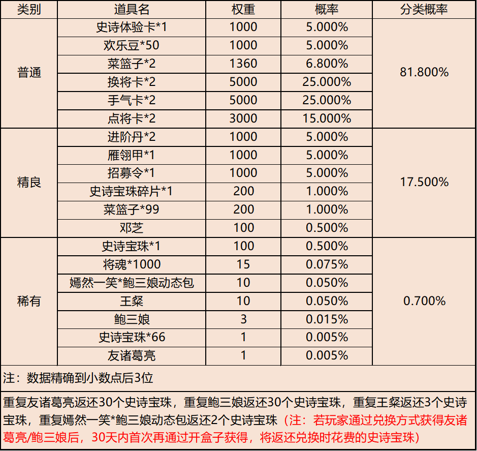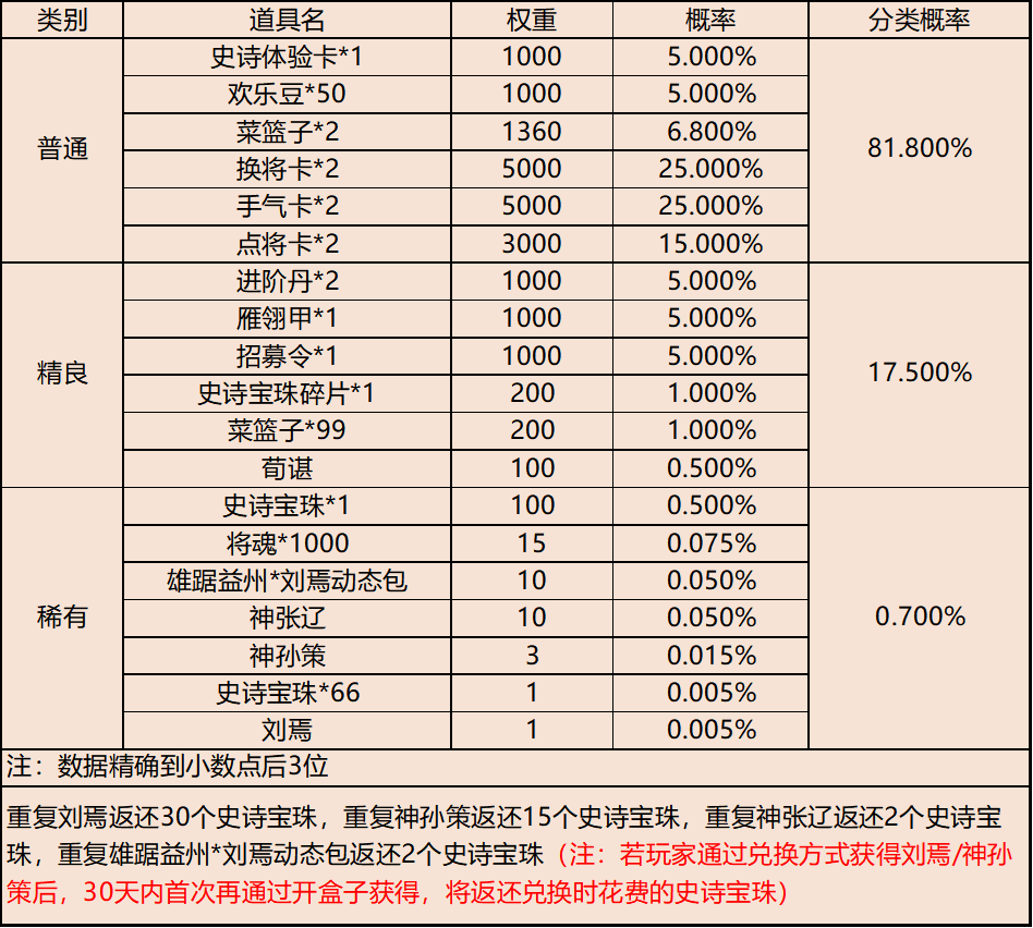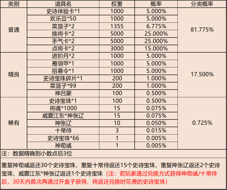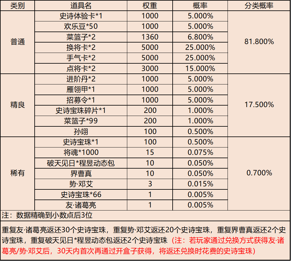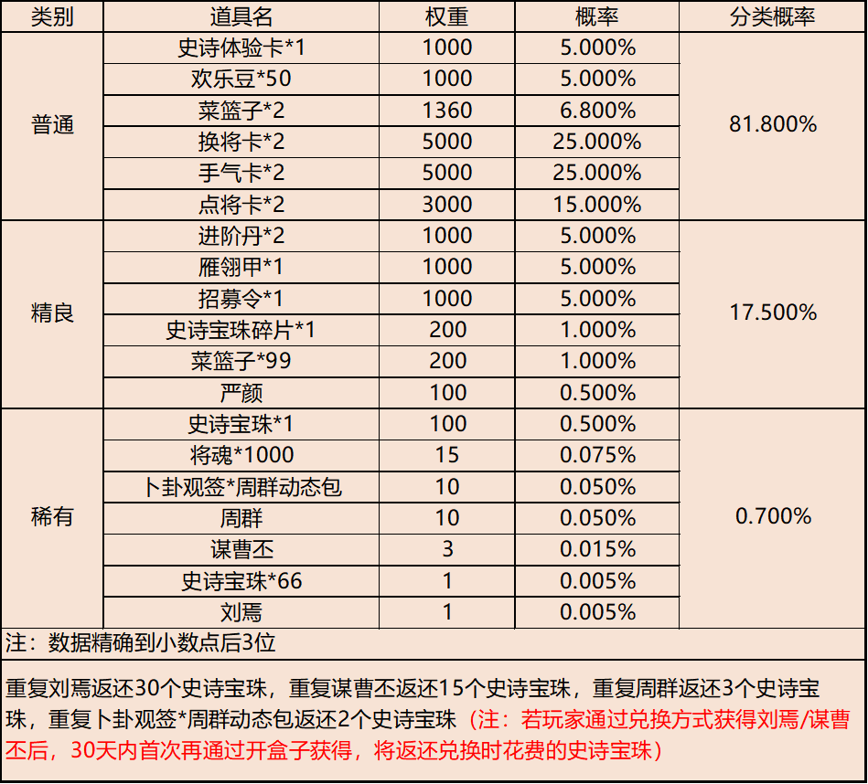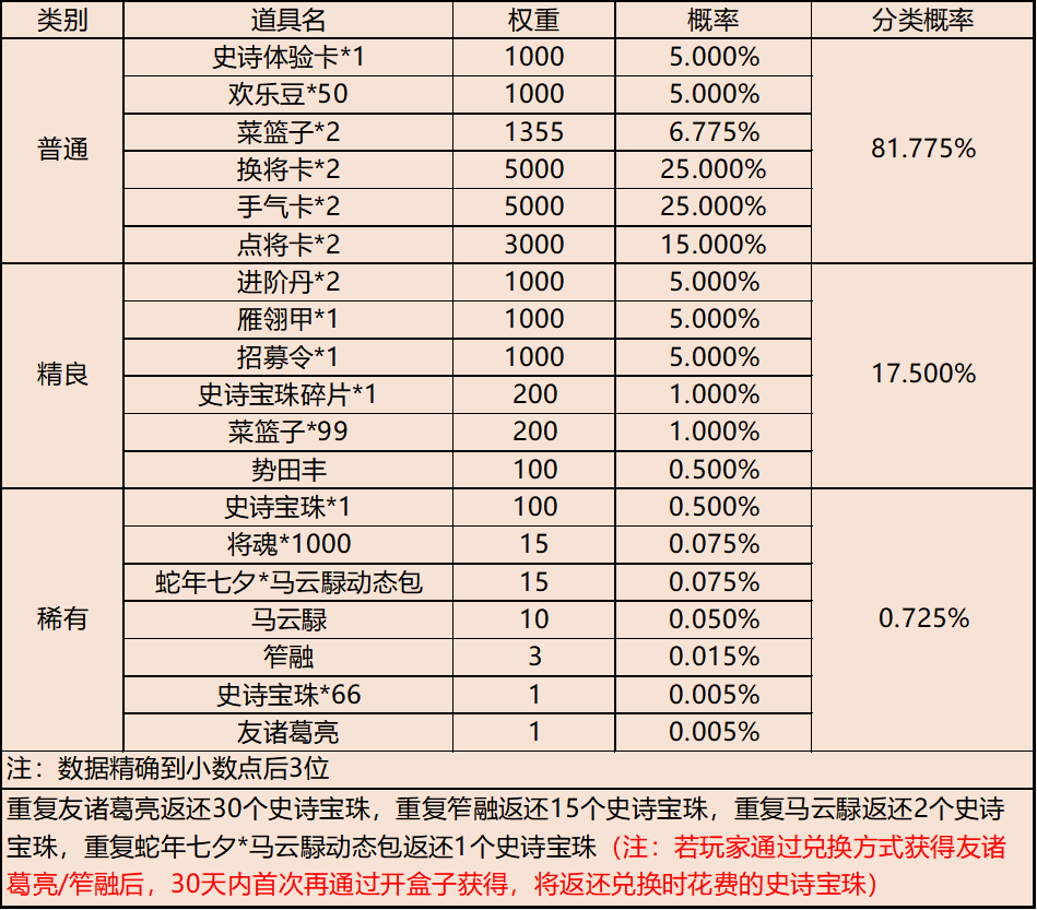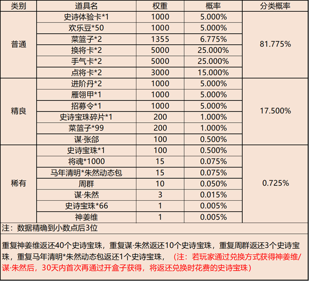 | 地点3-云梦泽 | 普通概率:50% | 稀有概率:30% | 史诗概率:15% | 传奇概率:3.5% | 神话概率:1.5% |
