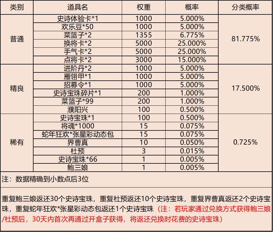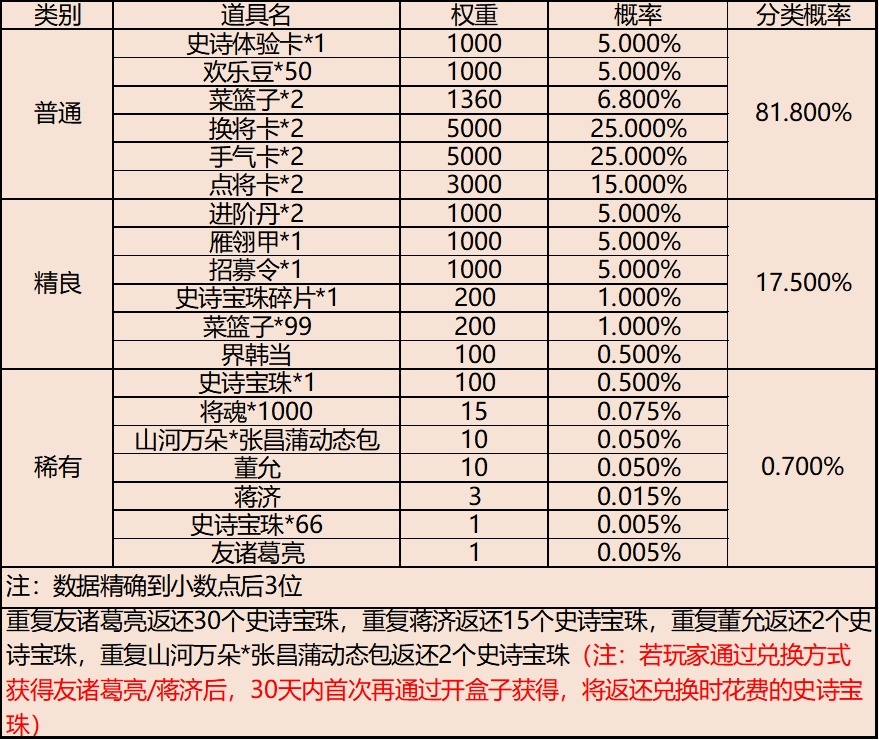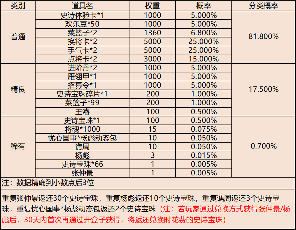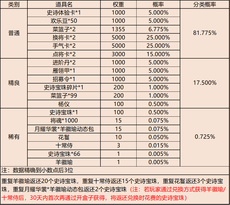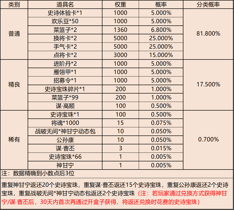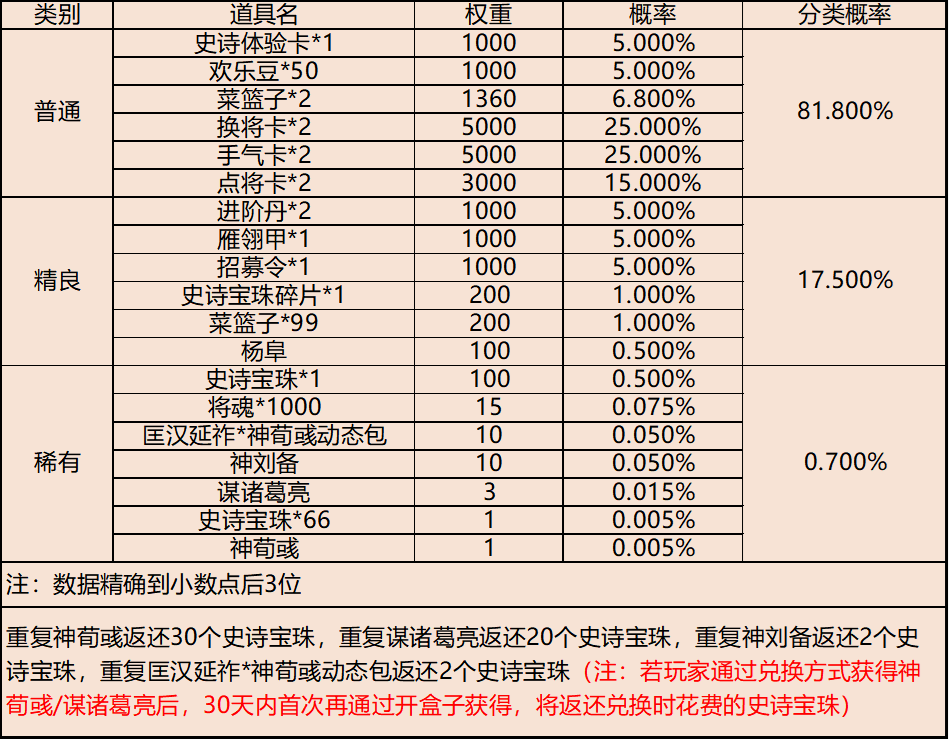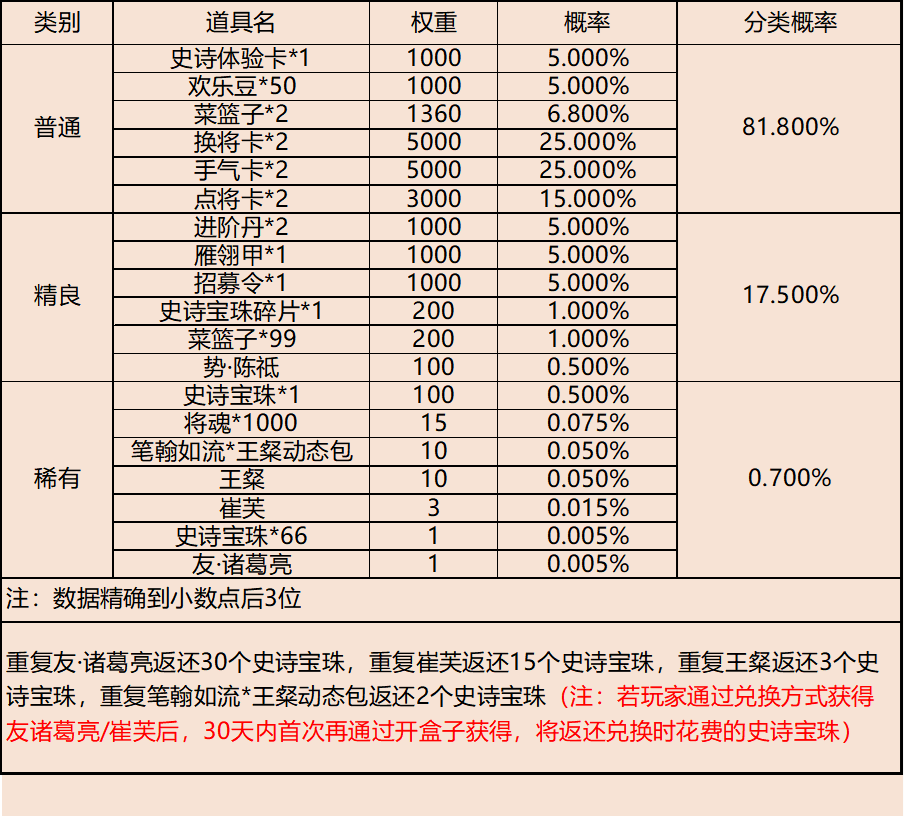 | 地点3-云梦泽 | 普通概率:50% | 稀有概率:30% | 史诗概率:15% | 传奇概率:3.5% | 神话概率:1.5% |