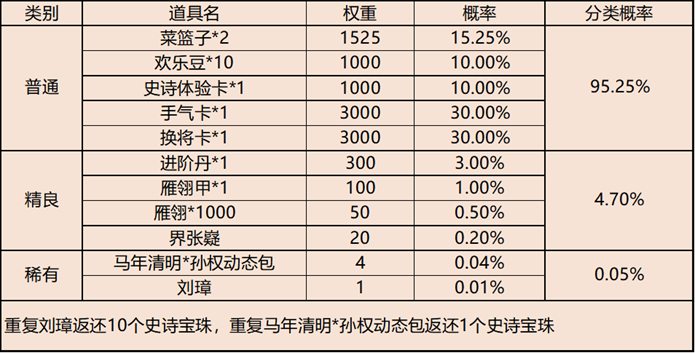 | 地点4-巨野泽 | 普通概率:50% | 稀有概率:30% | 史诗概率:15% | 传奇概率:3.5% | 神话概率:1.5% |