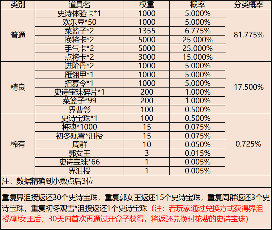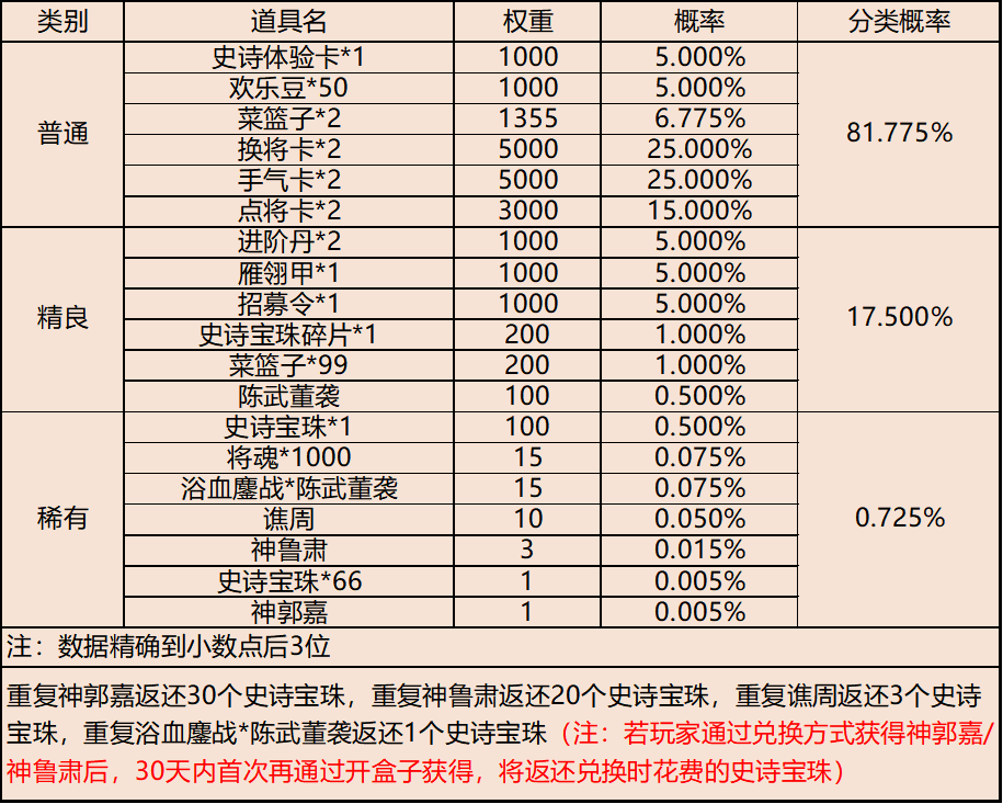 | 地点5-大陆泽 | 普通概率:50% | 稀有概率:30% | 史诗概率:15% | 传奇概率:3.5% | 神话概率:1.5% |